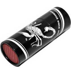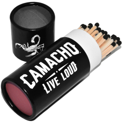 Niezwykle oryginalne pudełko wykonane w formie zamykanej tuby, zawierające około czterdziestu długich zapałek cygarowych z czarną główką. Zewnętrzna warstwa pudełka została polakierowana na czarny kolor i ozdobiona graficznym znakiem cygar Camacho - skorpionem. Wieczko posiada bezbarwną ściankę pozwalająca kontrolować ilość zapałek zaś w podstawie znajduje się potarka dla łatwego krzesania ognia.