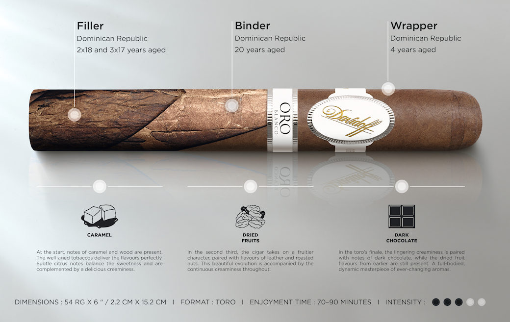 Cygara Davidoff Oro Blanco 111 Years z dumą zastąpiły legendarnego Oro Blanco Special Reserve 2002. Ta wyjątkowa edycja to kwintesencja kunsztu i mistrzowskiego rzemiosła, które zachwyci najbardziej wymagających aficionado. W 2014 roku Davidoff wprowadził na rynek Oro Blanco Special Reserve 2002, cygaro z blendem najrzadszych tytoni, dojrzewających ponad 12 lat. Sukces tej edycji sprawił, że do końca 2024 roku może ona zniknąć z rynku. W odpowiedzi na to Davidoff stworzył następcę, który redefiniuje standard cygar ultra-premium. Davidoff Oro Blanco 111 Years to dominikańskie puro, łączące siedem tytoni z pięciu regionów Dominikany: Bonao, Navarrete, Mao, Piloto i Yamasá. Tytonie te, starzone są od 17 do 20 lat, a cała kompozycja zdołała osiągnąć niepowtarzalny łączny wiek 111 lat, co czyni ten blend najstarszym na rynku. Co więcej, blend wyróżnia się nie tylko wiekiem, ale również rzadkością, gdyż część liści pochodzi z obszarów, których Davidoff już nie uprawia.