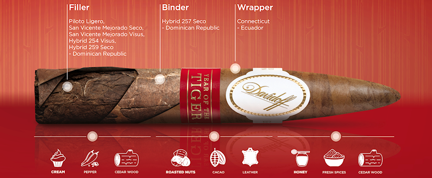 Jak to miało miejsce w poprzednich latach, również w 2022 roku nie zabraknie cygara i akcesoriów Davidoff stworzonych dla uczczenia Chińskiego nowego roku. Tegoroczne cygaro z edycji limitowanej doskonale odzwierciedla Rok Tygrysa. Tygrys jest odważny i zawsze gotowy do akcji, cygaro Davidoff Year of the Tiger, atakuje odważnymi smakami, a także opanowaniem, perfekcją i najwyższą jakością. Po raz pierwszy w historii limitowanych cygar marki Davidoff, zastosowano Ekwadorski wrapper Connecticut. Nie jest to jednak zwyczajny liść tytoniu, ale dzięki ręcznej obróbce nawiązano do pasów na futrze tygrysa. Cygaro przyjęło także agresywny kształt Piramidy. Wyrafinowana mieszanka przygotowana specjalnie na Rok Tygrysa składa się z trzech kapitalnych tytoni hybrydowych z Dominikany, których kulminacją jest nowa sensacja smakowa. Cygaro ma charakterystyczne nuty śmietanki, prażonych orzechów i miodu. Charakter Davidoff Year of the Tiger widoczny jest już na pudełku, opakowaniem zbiorczym podobnie jak w latach poprzednich jest oryginalna drewniana skrzynka. Box mieści dziesięć cygar oraz posiada swój indywidualny numer, cygara zabezpieczone są dodatkowo bardzo szczelnym kołnierzem wewnątrz skrzynki / humidora. Pod szklanym panelem znajduje się cedrowa - bambusowa dżungla imitująca naturalne środowisko tygrysa. Skrzynka skrywa w sobie 10 sztuk zdeterminowanych i gotowych wykorzystać każdą okazję tygrysów.