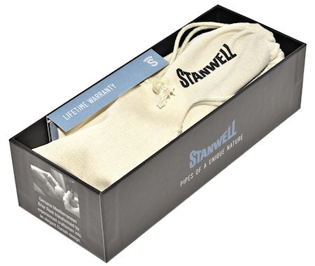 o dwoma elementami w kolorze srebra tj. pierścieniem i logo Stanwell-a - litera S w koronie. Ustnik to czarny, bardzo wytrzymały akryl. W zestawie oprócz fajki znajduje się jeszcze prezentowe (firmowe) pudełko, zasuwany mieszek i skrócona instrukcja obsługi z podstawowymi informacjami na temat fajek Stanwell.