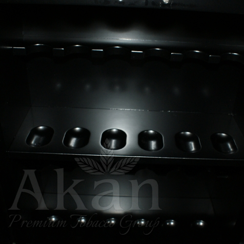 Drewniana szafka na 12 fajek. Zbudowana z drewna z dwoma skrzydłami oszklonych drzwiczek. Wewnątrz półki z miejscami na fajki (2 x 6) i jedna na akcesoria i tytoń.