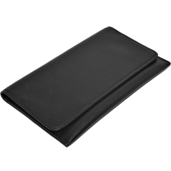 Niezwykle dobrze wykonany portfel na tytoń i bibułki z czarnej, delikatnej skóry, zamykany na dwa zatrzaski. Wyposażony w dozownik/uchwyt na bibułki i drugą, dodatkową przegrodę.