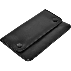Portfel na tytoń i bibułki wykonany z czarnej, delikatnej skóry, zamykany na zatrzaski. Wyposażony w dozownik/uchwyt na bibułki i jeszcze dodatkową przegrodę.