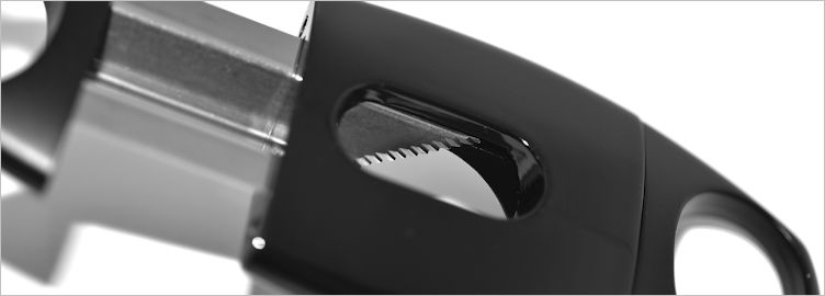 Bardzo masywna, metalowa obudowa skrywa ząbkowane ostrze. Otwarte tak cygaro pozwala