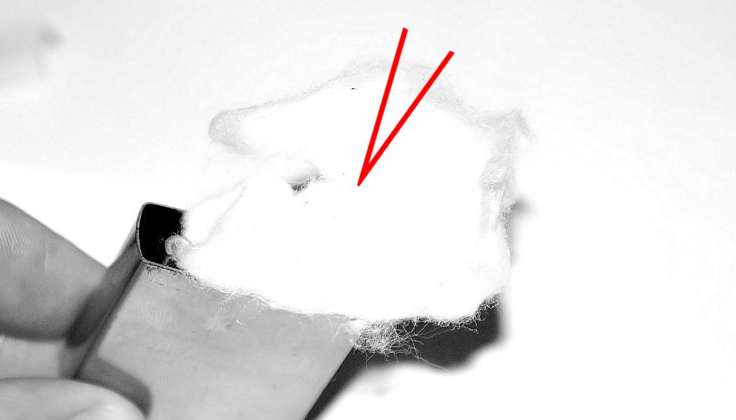Następnie zdejmujemy filcową wkładkę która zabezpiecza naszą benzynę przed wyciekaniem z waty. Po wykonaniu tego zadania mamy otwartą watę którą musimy wyjąć (najlepiej pęsetą).