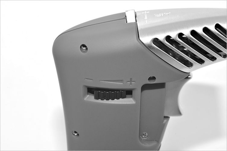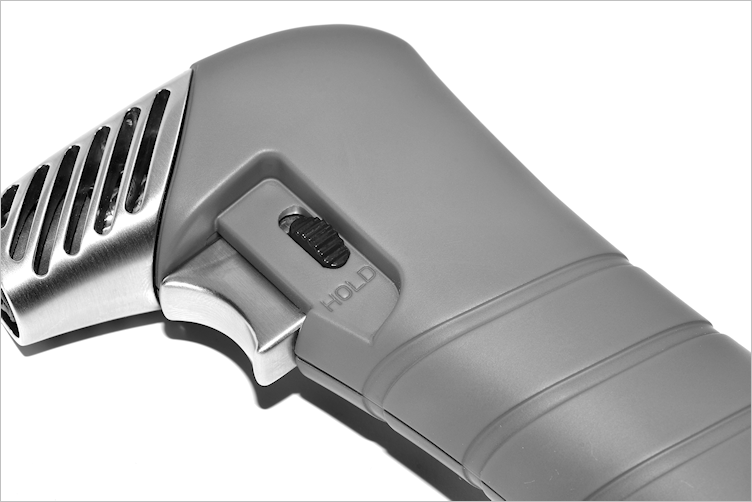 Po przeciwległej stronie obudowy do regulacji mocy znajduje się przełącznik bezpieczeństwa który blokuje możliwość uruchomienia zapalniczki. Ustawiając pokrętło w dolne położenie mamy zapalniczkę całkowicie zablokowaną. Przycisk otwierający gazową dyszę i uruchamiający jednocześnie mechanizm piezzo-elektryczny naciskamy chwytem pistoletowym.